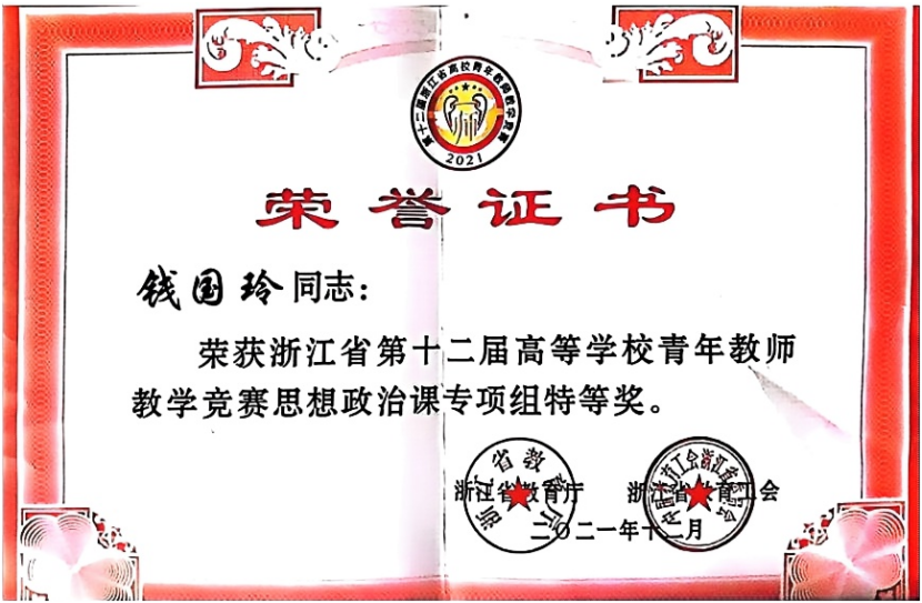 钱国玲,法学博士,现德法教研室教师,讲授《思想道德与法治》、《医学伦理学》等课程。其中,《思想道德与法治》入选伟德国际唯一官网2022年度校级“一流本科课程”,《医学伦理学》入选2022年省级课程思政示范课,校级思政教育精品育人工程。先后在《浙江大学学报》、《人大复印报刊资料》、《现代出版》等期刊发表论文10余篇,出版专著1部、编著1部、参编省级规划教材1部。主持省部级课题2项、校级课题5项。
