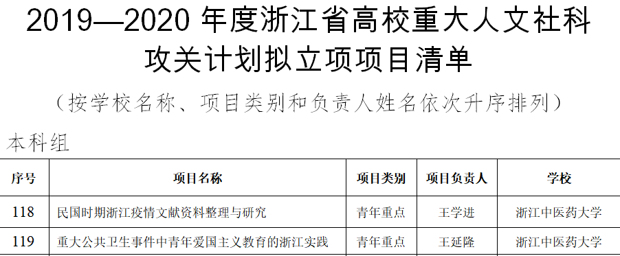 今日,浙江省教育厅公布了2019—2020年度浙江省高校重大人文社科项目攻关计划项目遴选结果,bevictor伟德国际有2个项目喜获立项。获批的2个项目分别是王学进申报的《民国时期浙江疫情文献资料整理与研究》和王延隆申报的《重大公共卫生事件中青年爱国主义教育的浙江实践》。