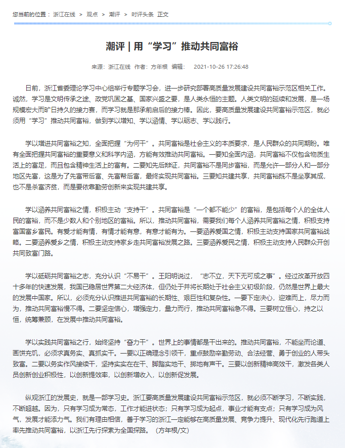 日前,公司党总支书记方年根教授在浙江省委省政府新闻门户网站《浙江在线》发表评论文章《用“学习”推动共同富裕》。