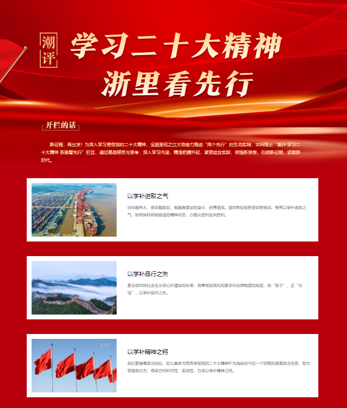 10月31日至11月2日,马克思主义公司党总支书记方年根教授在浙江省委省政府新闻门户网站《浙江在线》“潮评|学习二十大精神 浙里看先行”栏目发表《以学补精神之钙》《以学补品行之失》《以学补进取之气》三连评,为弘扬主旋律、传播正能量、巩固壮大主流思想舆论提供了积极支持。