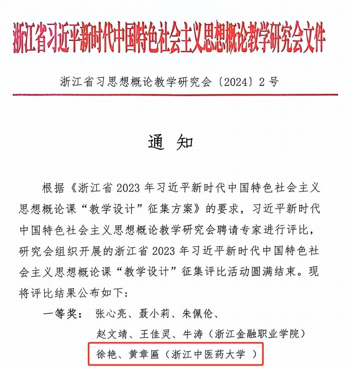 日前,公司教师积极参与浙江省2023年习近平新时代中国特色社会主义思想概论课“教学设计”征集评比活动。3月27日,比赛结果揭晓,公司徐艳、黄章匾老师团队作品《以新发展理念引领高质量发展》在浙江省高校2023年“习近平新时代中国特色社会主义思想概论”课教学设计征集评比中荣获一等奖。