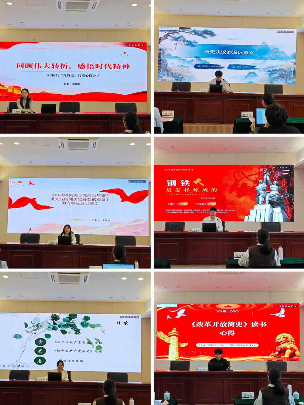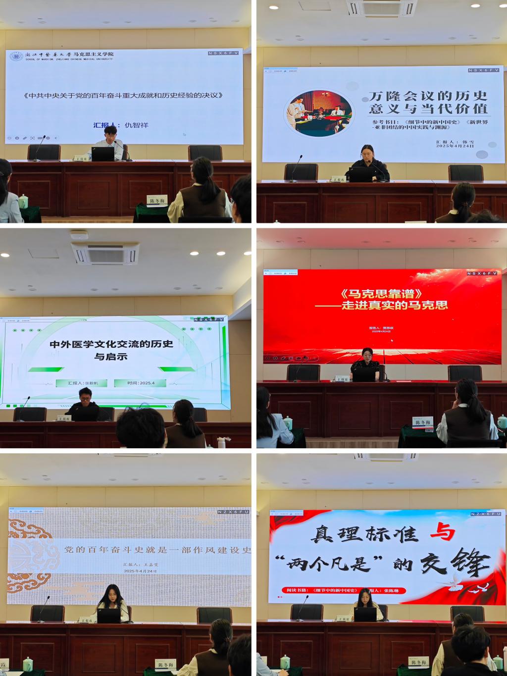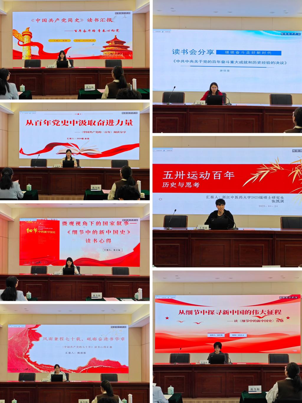 研究生以自主阅读的指定书目为切入点,依次上台结合PPT分享自己的感悟心得。在读书研讨过程中深入学习贯彻习近平总书记关于中国共产党历史的重要论述,学好用好红色经典和重大主题读物,通过研读党史经典著作回顾百年大党波澜壮阔的奋斗历史,学习红色历史、品读红色故事、传承红色基因,感悟承载其中的红色文化和伟大精神,汲取砥砺前行的精神力量。