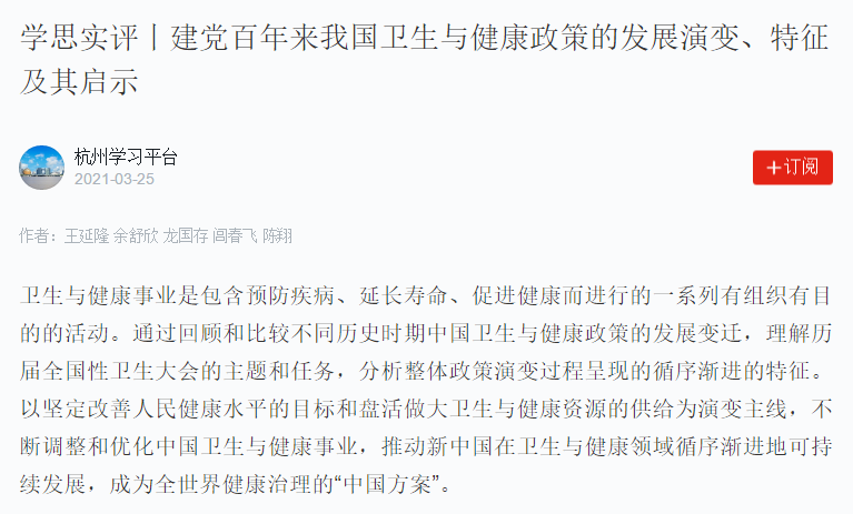 近日,公司王延隆老师所撰文章《建党百年来我国卫生与健康政策的发展演变、特征及其启示》为学习强国杭州学习平台“学思实评”专栏收录。