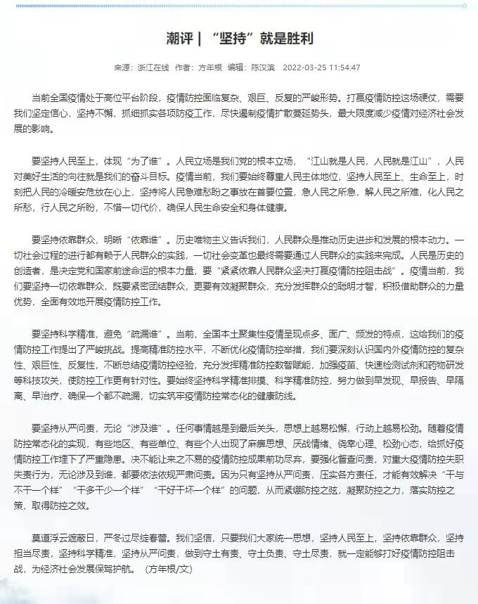 日前,公司党委组织部印发了《关于充分发挥各级党组织作用为疫情防控、助力亚运提供坚强保证的通知》。今天,马克思主义公司党总支书记方年根教授在浙江省委省政府新闻门户网站《浙江在线》发表评论文章《“坚持”就是胜利》,为做好新形势下疫情防控工作提供积极舆论支持。