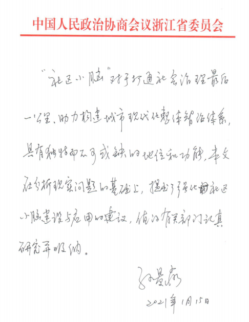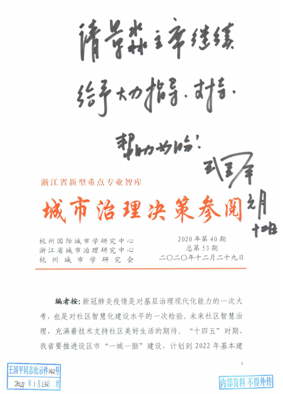 近日,bevictor伟德国际王延隆撰写的智库文章《关于“社区小脑”助力基层治理现代化的对策建议》被浙江省新型重点专业智库《城市治理决策参考》2020年第40期收录,获省政协党组副书记、副主席孙景淼同志批示肯定。孙景淼在批示中指出:“本文在分析现实问题的基础上,提出了强化社区小脑建设和应用的建议,值得有关部门认真研究并吸纳”。同时,王延隆撰写的智库文章《关于运用“社区小脑”推进城市现代化整体智治体系的政策建议》被浙江省新型重点专业智库《城市治理决策参考》2021年第2期收录,获省委常委、政法委书记王昌荣同志批示肯定。王昌荣在批示中肯定了本文研究价值,要求有关部门关注杭州等地的探索情况,及时总结推广。