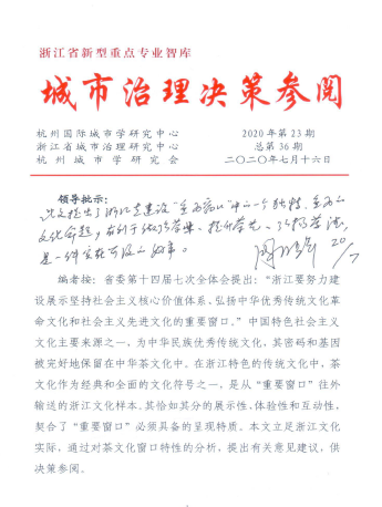 近日,由公司王延隆副教授完成的《以茶文化为特色推进浙江坚持社会主义核心价值体系,弘扬中国特色社会主义文化的重要窗口的建议》决策参阅,获得了省政协副主席周国辉的明确批示。该成果提出了浙江省建设“重要窗口”中的一个独特、重要的文化命题,有利于做强茶业,提升茶艺,弘扬茶德,是一项实在可及的好事。 本项决策参阅得到省领导的直接批示,不仅体现了公司科学研究水平不断提高,更体现了公司“城校共生、产教共融”、做好科研服务经济社会高质量发展愿景,提升了公司省内地位和影响力。