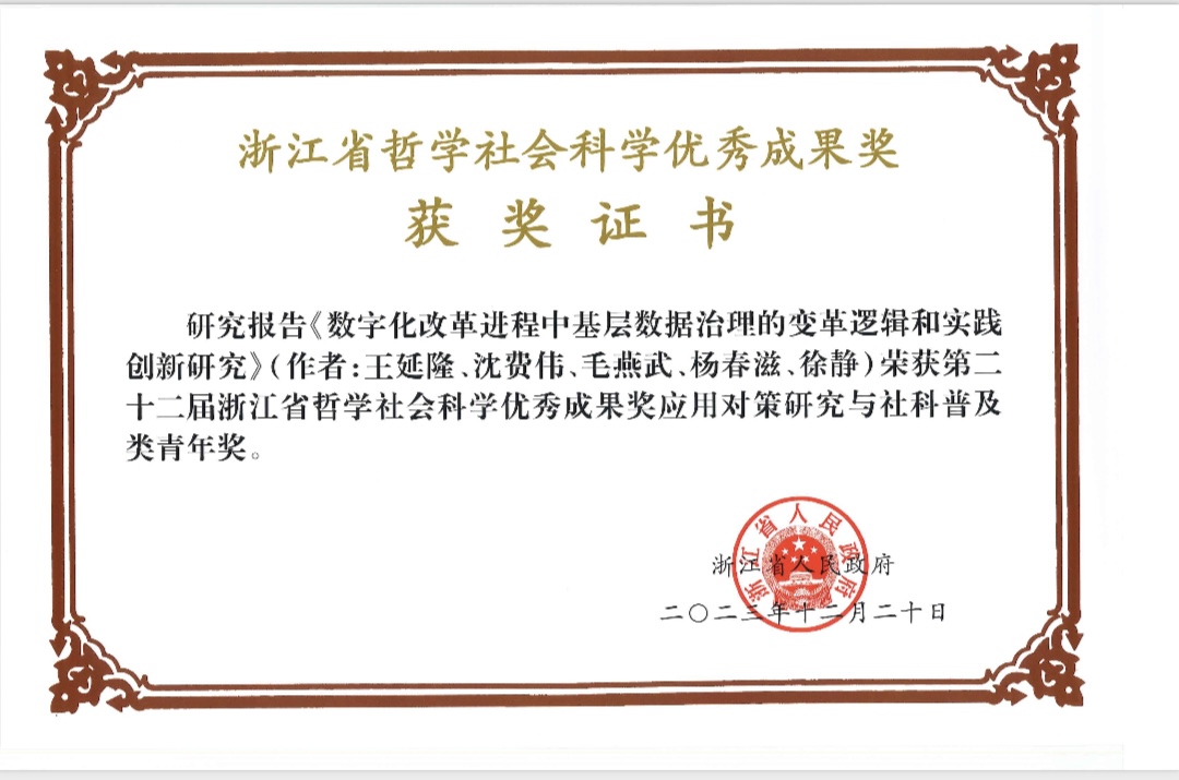 2023年12月,浙江省社会科学联合会、浙江省哲学社会科学工作办公室发布了《关于公布第二十二届浙江省哲学社会科学优秀成果奖获奖名单的通知》,公司副经理王延隆教授等提报的研究报告《数字化改革进程中基层数据治理的变革逻辑和实践创新研究》荣获应用对策研究与社科普及优秀成果奖青年奖,实现了公司在省哲社优秀成果奖的新突破。