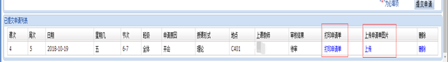 3.填完以上信息后点击提交申请,即可打印核对调课申请单,并完成纸质申请单上任课教师签名,教研室、公司审核盖章等流程。点击上传按钮,将纸质申请单以图片的形式上传。