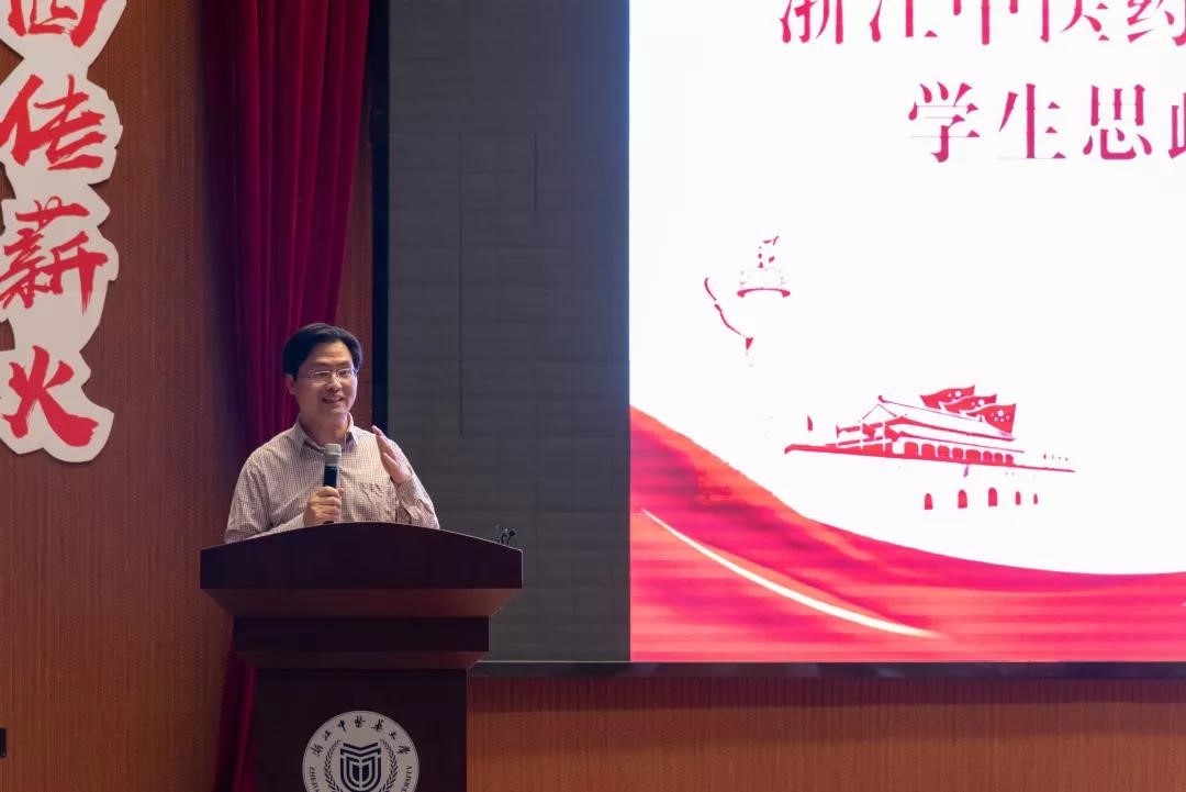 之后,陈烈荣教授对选手们精彩的讲课表现进行了点评总结。他用精彩、优秀、宽广三个词概括了选手们的表现,赞扬他们体现出了浙中医大学子的优秀风采和素养。他认为这不仅仅是一场比赛,更是教学成果的汇报会,个人思想的交流会,思政理论课程的研讨会,思政理论课程是将老员工培养成社会主义接班人的重要课程。通过比赛,同学们更能体现到思政理论课老师上课的不易。他真切地希望同学们在以后的思政课学习中可以多走上讲台,为同龄人讲课,并号召公司员工能成为争做“有理想、有本领、有担当”的有志有为新青年。