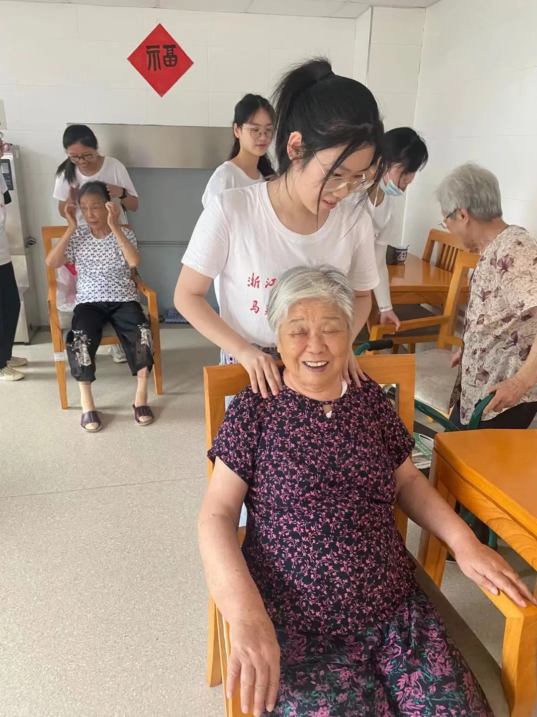在走进养老院之前,我会以为那里的老人家都会是很孤单的,然而这次的实践活动,两个养老院,我遇到的都是开朗健谈的老人,了解了他们的故事,走进了他们的生活。在富阳的养老院,我发现了养老院的作息表,原来老人家也要五点半起床,八点入睡,准时作息,我觉得挺奇妙的。我们为他们量血压、按摩、表演才艺,我们小组准备了歌曲和太极拳表演,总是有奶奶爷爷为我们鼓掌,会热情的和我们握握手,哦对了,还有时髦的爷爷奶奶还会刷抖音,惊呆我了都。虽然可能平时子女们不常回来探望,但是老人家们都很自在地过着自己的生活,身边的照料者也很细心热情,我们还能给他们带来一份快乐,自己也觉得很有成就感。