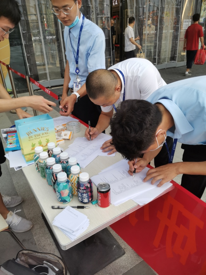 7月15日上午,小队继续进行激情讨论,并筹划摆摊的细节。下午,小队到万达广场进行紧张筹备,小队成员带上了统一的工作牌,在万达商场的支持下,由万达商场提供北门入口场地和桌椅,挂上了“杭州地区公共卫生意识调研小分队”的大横幅。傍晚正是万达广场人流量最集中的时段,小队成员和两位带队老师一同于万达广场北门门口正式摆摊调研。小队采取了受访者参加调研就可以抽奖的形式,加上小队成员的卖力吆喝,吸引了大批民众前来,摊位口被挤得水泄不通。小队成员一一分工,有条不紊地开展问卷发放回收工作,有的队员指导受访者填写问卷,有的队员忙于讲解新冠疫苗相关知识,有的队员忙于递上抽奖盒,有的队员忙于派发奖品,很多居民对我们的工作表示了理解和支持,摆摊调研的方式进行得出乎意料地顺利。一晚上下来,虽然十分疲惫,甚至累倒坐在地上,但是小队成员的成果颇丰,小队一共回收了近三百分问卷。不仅调研的成果令人欣喜,小队成员对新冠疫苗接种情况有了更广泛的了解,并且在这次调研中磨练了自己坚持不懈的意志,提高了应对困难、适应社会的能力。