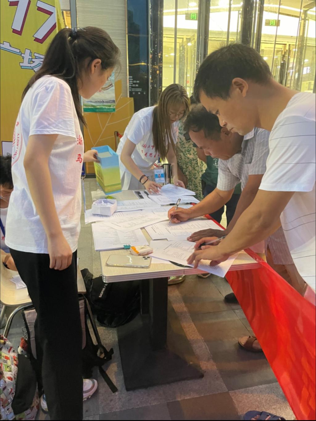 但是同学们并没有气馁,小队成员进行了深刻反思,经过集体讨论,总结了自身的失误,认识到不考虑时间和人流量的调研是行不通的,下一步最好找一个人流量大的固定地点派发问卷,并通过制定工作牌、选取某个固定地点并获得官方认可等方式来提升受访者对实践小队的信任度,采取填问卷抽奖等措施增加受访者的参与积极性。在龙国存、朱耿华两位老师的指导和全力支持下,小队制定了到富阳区人流量最大的万达广场进行摆摊调研的计划。