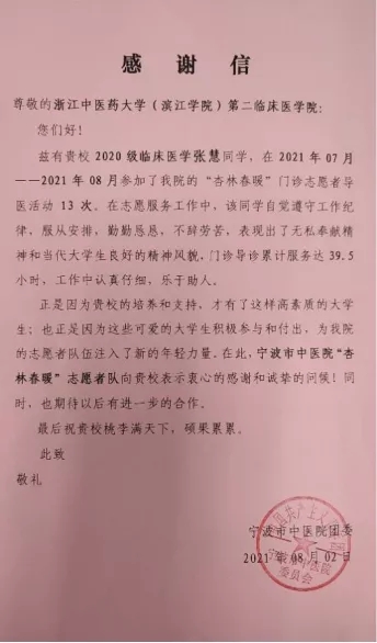 病魔”无情,“杏林”有爱工作中,张慧同学扎实肯干、认真负责、运用所学回馈社会,为他人送温暖,为社会做贡献,用青春的热血擦亮为民服务的底色,减轻了医务人员的工作压力改善群众就医体验深受医院工作人员和群众肯定让患者深切感受到就诊便利和人间关爱。