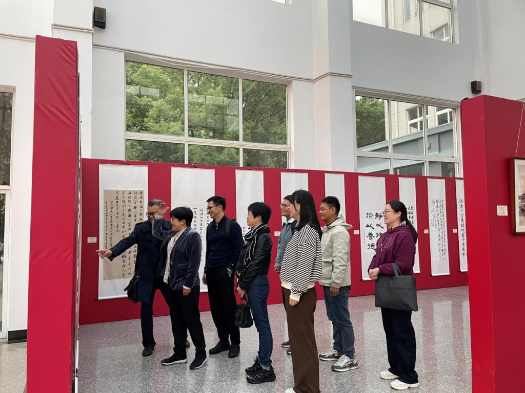 2024年10月30日,党支部成员在滨文校区图书馆一楼大厅观看伟德国际唯一官网建校65周年书画展。